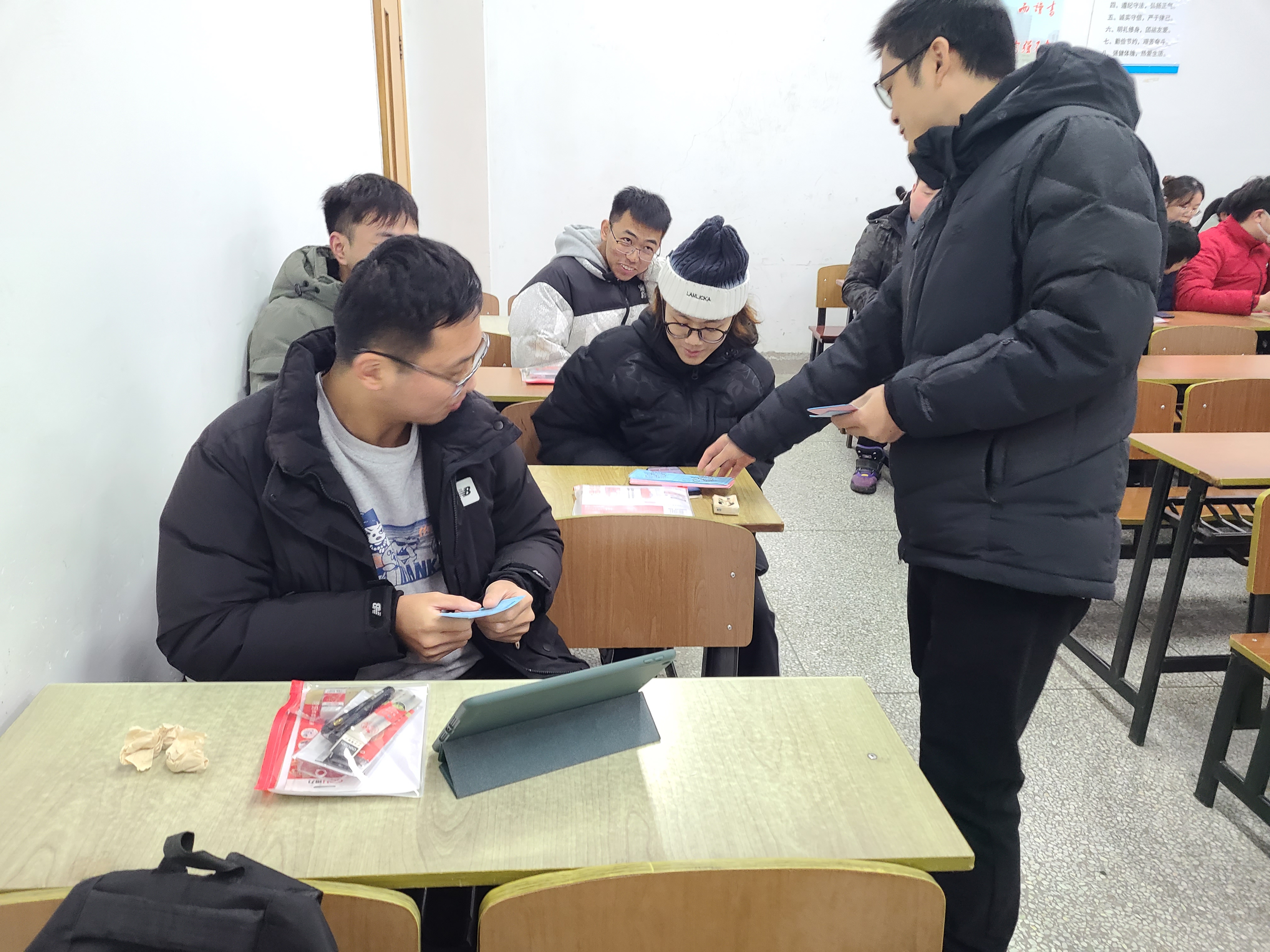 辅导员管宝儒与员工进行互动,以考生接龙的方式提醒大家考研需要注意的事项:1.带好相关证件;2.规划好出行路线;3.注意保暖和饮食;4.放松心态,积极应考。