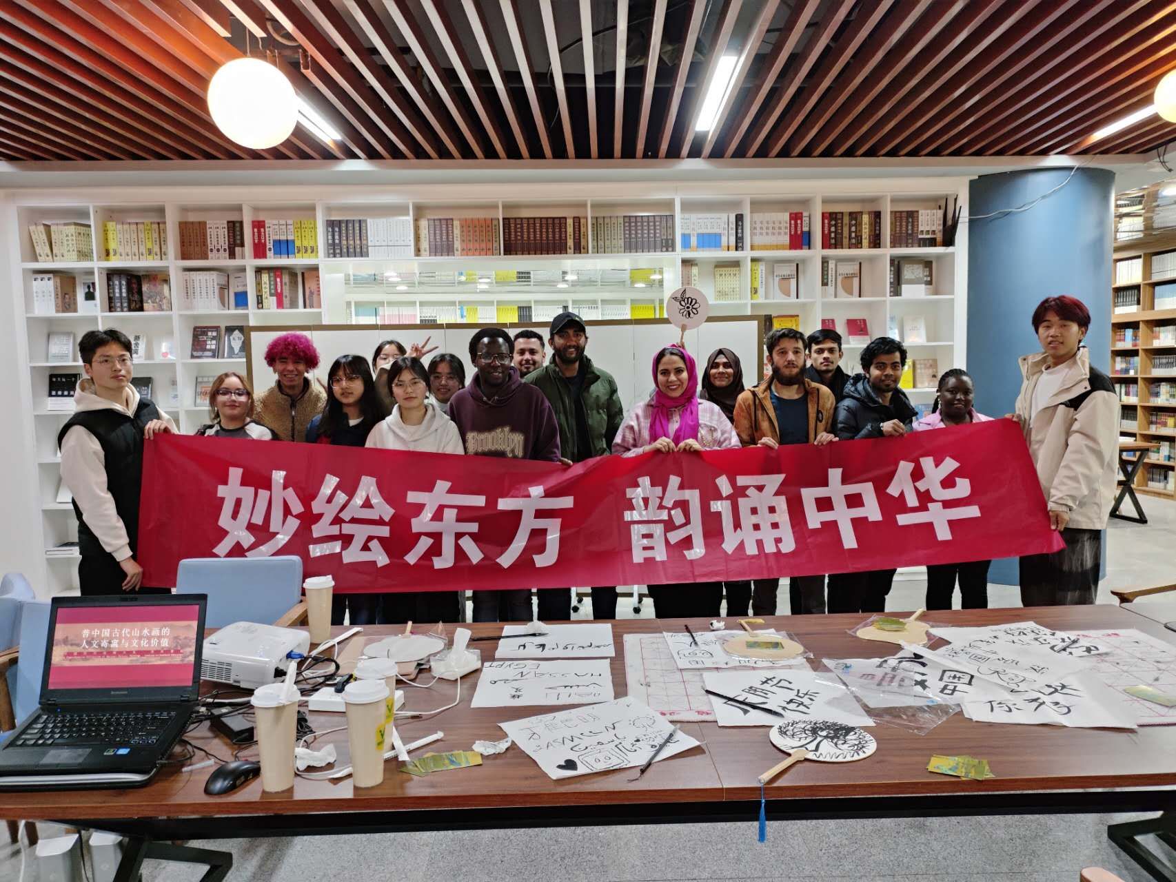 4月3日下午,云顶国际yd888图书馆一楼的先鸣书店,中国传统绘画艺术演讲体验活动在此热烈开展,云顶国际yd888小雨点志愿者队特别邀请了淮阴师范学院美术学院的同学,共同为国际教育学院的外国职工带来了一场文化盛宴。