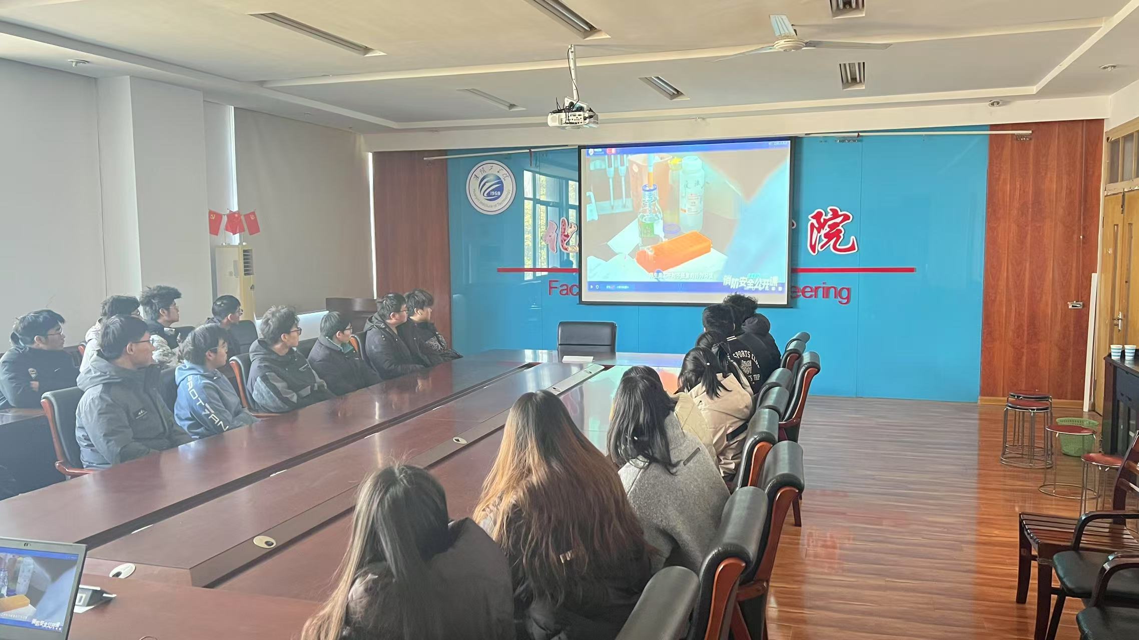 学工办主任袁野,结合近年来高校火灾典型案例,播放了专题教育视频。视频内容涵盖火灾成因分析、初期火灾扑救方法、火场逃生技巧及消防器材使用规范等实用知识,直观展示了实验室、宿舍、教室等校园场景的消防安全隐患排查要点。现场学习氛围浓厚。